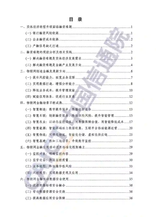 报告提出了物联网金融在智慧制造、智慧车联、智慧农业、智慧能源、智慧物流、智慧基建的6大应用场景。同时,确立了物联网金融标准的框架,明确了监控对象、监管设备、业务流程、风控模型等具体内容。