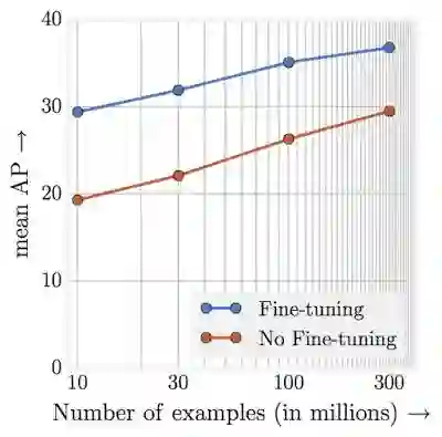 ▲ 通过针对 JFT-300M 的不同子集从零开始进行预训练时的对象检测性能。X 轴是以对数表示的数据集大小,y 轴代表针对 COCO-minival 子集的 mAP@[.5,.95] 检测性能。