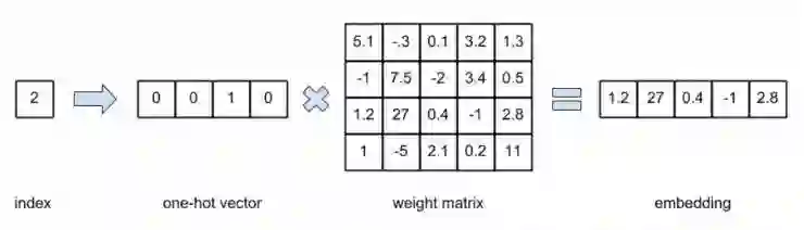 在数学中,嵌入指的是从空间 X 到 Y 的映射,同时保留对象的一些结构(例如它们的距离)。然而,在神经网络的上下文中使用嵌入通常意味着将分类(离散)变量(例如,单词索引)转换为连续向量。直接将单词索引作为输入传递给网络将使其工作变得非常困难,因为它需要为每个索引值都提供一个二进制特征(假设它们是不相关的)。于是,我们通过一个网络将分类值转换为 one-hot (独热)矢量。如果将独热矢量与权重矩阵相乘,这就相当于从权重矩阵中选择一个给定的行。在各类神经网络开发库中,通常会跳过转换为独热矢量并乘以权重矩阵的步骤,而是直接使用索引从权重矩阵中选择一行,并将其视为查找表。其中最重要的方面是,嵌入向量是通过学习得到的,就像使用独热向量学习权重矩阵一样。