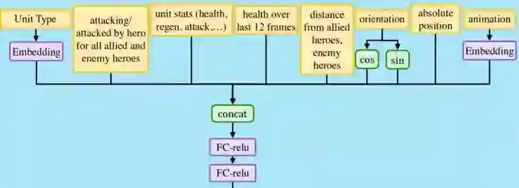 其中的每一个特性都可能在嵌入向量中形成一个维度,并且网络可以自动学习每个英雄中的核心、辅助或打野的成分是多少。 相同的嵌入也适用于小兵和建筑物,例如塔也有远程攻击。这样就形成了一种通用的方式,在网络内表示各种不同的单位。嵌入向量与其他单位属性(如血量,英雄距离等)联系在一起。
