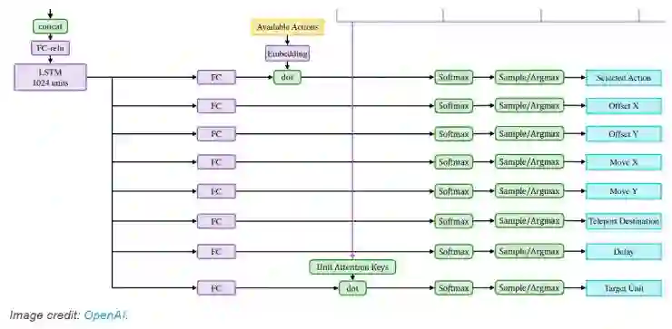 虽然关于 OpenAI 的 AI 的举止以及关于这些比赛对于整个 AI 界的意义的讨论已经不少了,但关于这些 AI 的训练方法和网络架构的技术分析异常地少。到目前为止,技术分析主要都源于最初 OpenAI Five 的博客文章。在某种程度上他们确实说得挺合理,他们使用标准 PPO 算法(几年前他们自己发明的)和经过验证确实有效的自我训练方案(也在他们的论文 https://arxiv.org/abs/1710.03748 中记录)是合理的。但博客文章中有一个容易错过的细节,那就是指向他们的网络架构图的一个超链接。