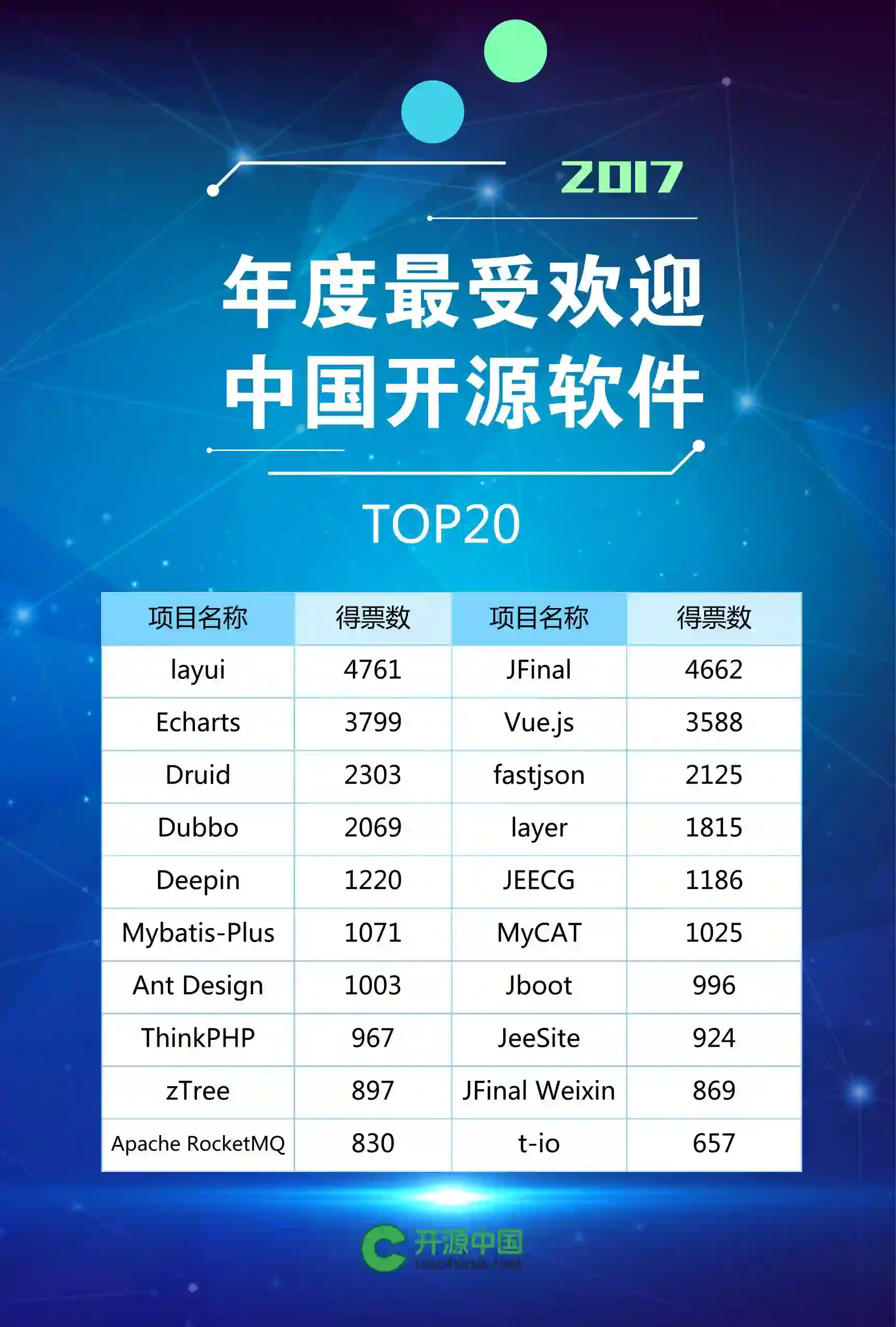 11月27日,由开源中国、JetBrains 协办的“2017 年度最受欢迎中国开源软件评选”正式上线。经过半个多月的投票决选,以及各位开源软件作者、开源爱好者以及 OSChina 会员的积极参与,2017「年度最受欢迎中国开源软件 TOP20 」正式揭晓。