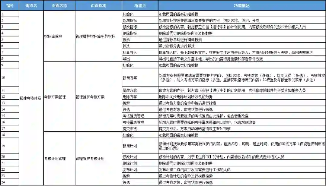 其次,功能列表的梳理部分,基于绩效管理的流程图,先写出核心的功能点如、批量导入、导出等;②考核方案管理中的新增/修改/删除方案、考核维度管理、考核量表管理、提交审核等;③考核计划管理中的发布/新增/修改/删除计划等。并补充其他内容如:页面初始化、搜索、筛选等等,该模块内容清晰,且完整度比较高。