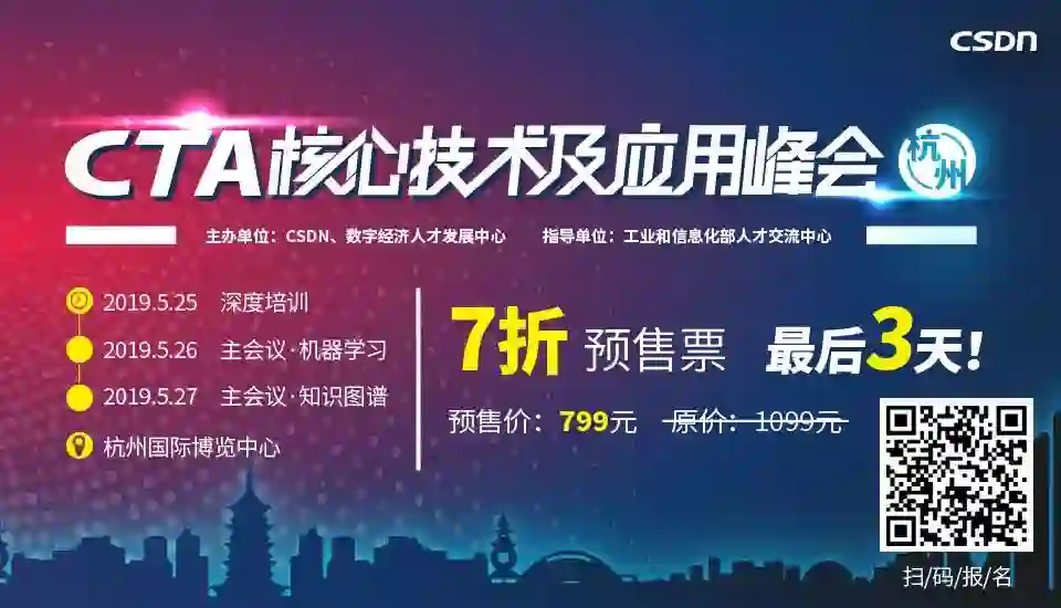 2019 年 5 月 26 - 27 日,由中国 IT 社区 CSDN 与数字经济人才发展中心联合主办的第一届 CTA 核心技术及应用峰会将在杭州国际博览中心召开。近 500 名开发者将齐聚于此,共同交流探讨机器学习和知识图谱的技术及行业落地趋势。