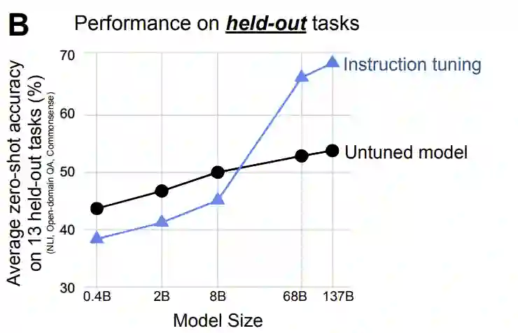 作者们训练了一个大小为137B的自回归语言模型(Base LM) 作为基准语言模型。通过简单的重采样方法,作者们让不同大小的数据集在总的微调语料中占比相对平衡。在微调时,对每一个输入样本都随机选取该类任务十条指令中的一条以增加模型的多样性。为了保证实验对比的公平性,当评测在某一个任务(例如RTE)上的表现时,所有的同类别数据集(例如:SNLI,WNLI,MNLI...)和一些强相关类别的数据集(例如Paraphrase)将不会在微调阶段出现。