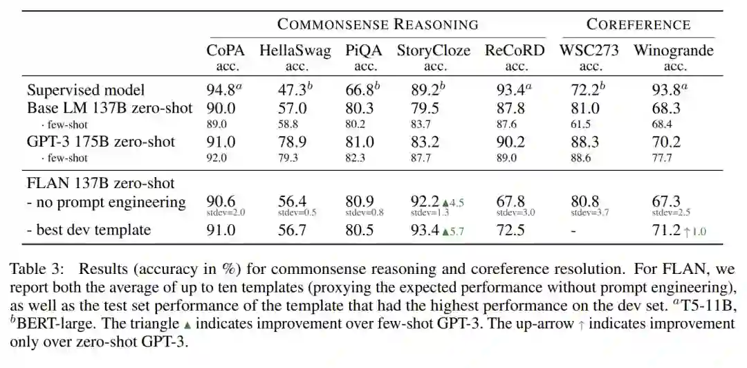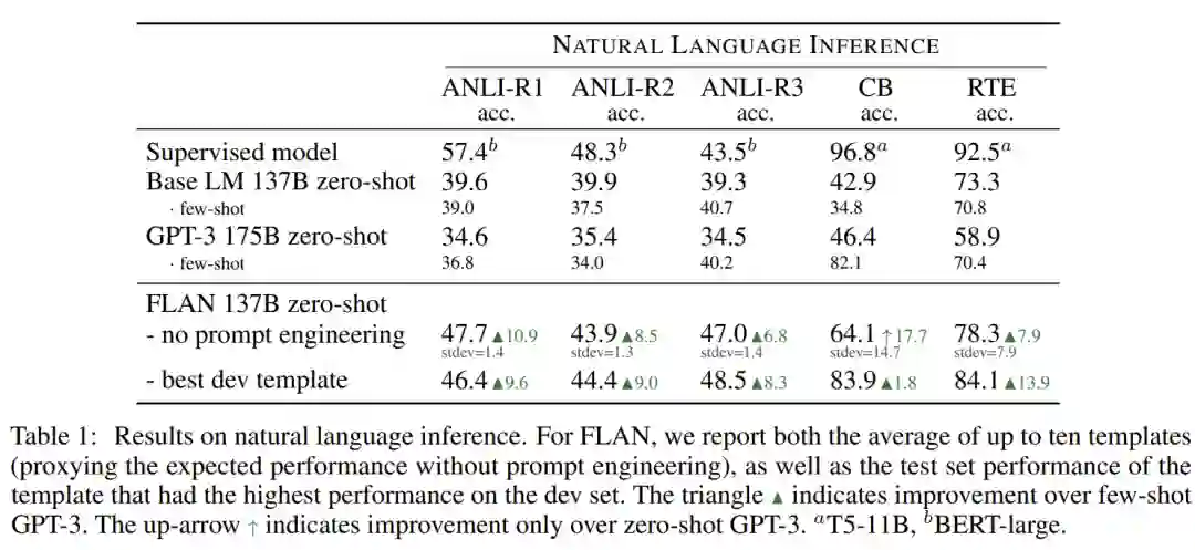 作者们使用了T5-11B和GPT-3作为基线模型。对于FLAN方法,作者同时给出了在目标任务上选择随机指令(no prompt engineering) 和在目标任务验证集上最优指令(best dev template)
