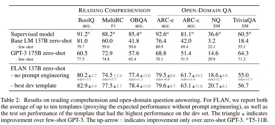 在自然语言推断任务和问答任务上,FLAN在零样本场景下就已经超过了小样本GPT-3的效果,在许多任务上甚至与有监督模型达到了相当的表现。