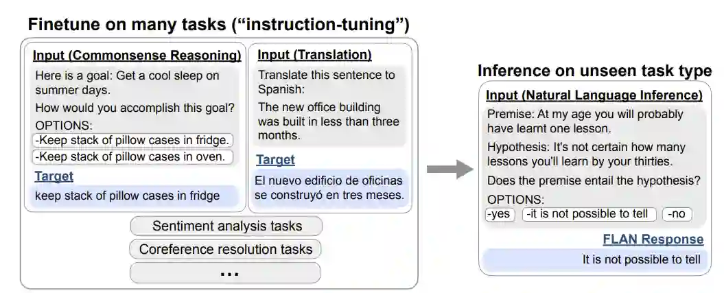 例如,我们的最终目标是推理任务,FLAN首先讲语言模型在其他任务上进行微调,包括给定任务指令的翻译、常识推理、情感分类等。在面对翻译任务时可以给出指令“请把这句话翻译成西班牙语”。在面对常识推理任务时可以给出指令“请预测下面可能发生的情况”,而当模型根据这些“指令”完成了微调阶段的各种任务后(将指令拼接在微调数据的前面),在面对从未见过的最终需要的自然语言推理任务的指令“这段话能从假设中推导出来吗?” 时,就能更好地调动出已有的知识回答问题。