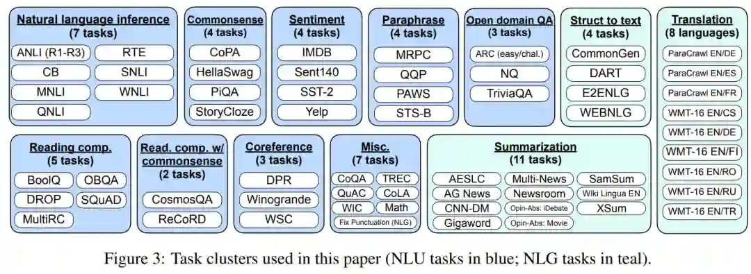 作者们选取了12类共计62个常见的自然语言处理和生成任务开展实验: