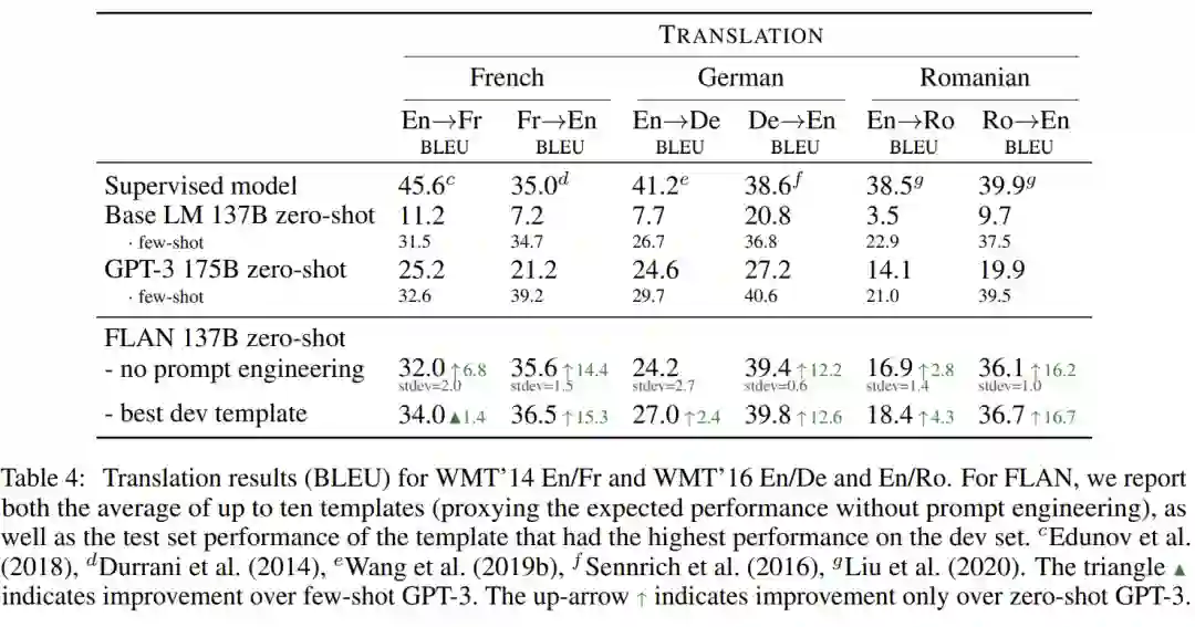 在翻译任务上,零样本场景下的FLAN明显优于GPT-3,但相比于小样本GPT-3的表现仍然有差距。