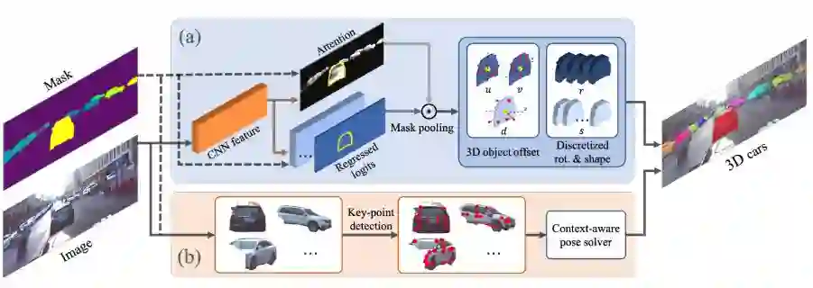 自动驾驶引起了工业界和学术界的极大关注。一项重要的任务是估计道路上移动或停放的车辆的3D属性(例如平移,旋转和形状)。这项任务虽然至关重要,但在计算机视觉领域仍未得到充分研究,部分原因在于缺乏适用于自动驾驶研究的大规模和完全标注的3D汽车数据集。在本文中,我们提供了第一个适用于3D汽车实例理解的大型数据库- ApolloCar3D。该数据集包含5,277个驾驶图像和超过6万个的汽车实例,其中每辆汽车都配备了具有绝对模型尺寸和语义标记关键点的行业级3D CAD模型。该数据集比PASCAL3D +和KITTI(现有技术水平)大20倍以上。为了在3D中实现高效标注,我们通过考虑单个实例的2D-3D 关键点对应关系和多个实例之间的3D关系来构建流程图。配备这样的数据集,我们使用最先进的深度卷积神经网络构建各种基准算法。具体来说,我们首先使用预先训练的Mask R-CNN对每辆车进行分割,然后基于可变形的3D汽车模型,使用或不使用语义关键点,对其3D姿态和形状进行恢复。我们证明,使用关键点显着提高了拟合性能。最后,我们开发了一个新的3D指标,同时考虑3D姿态和3D形状,满足全面的评估和模型简化测试。通过与人类表现的比较,我们提出了几个未来的改进方向。