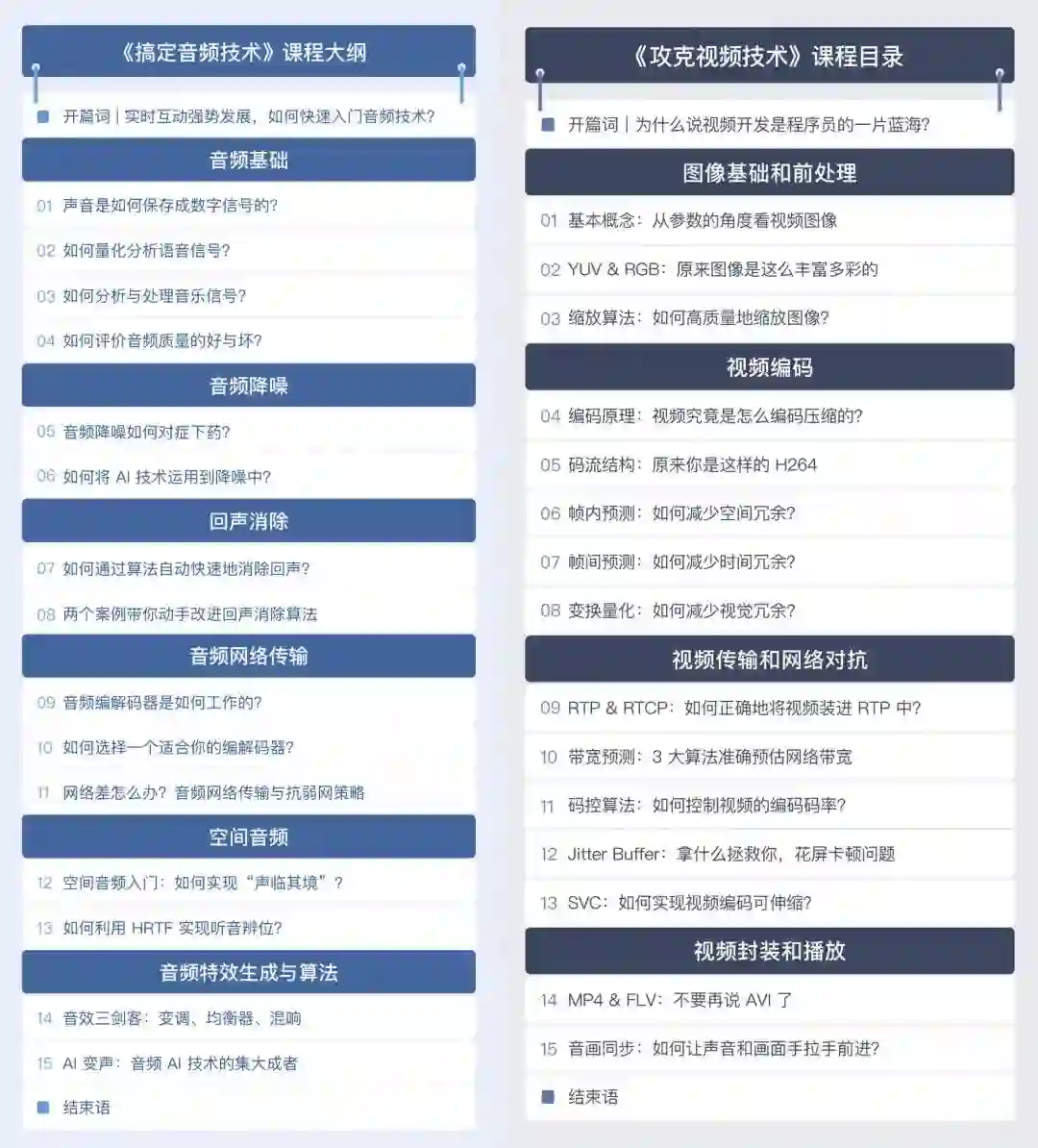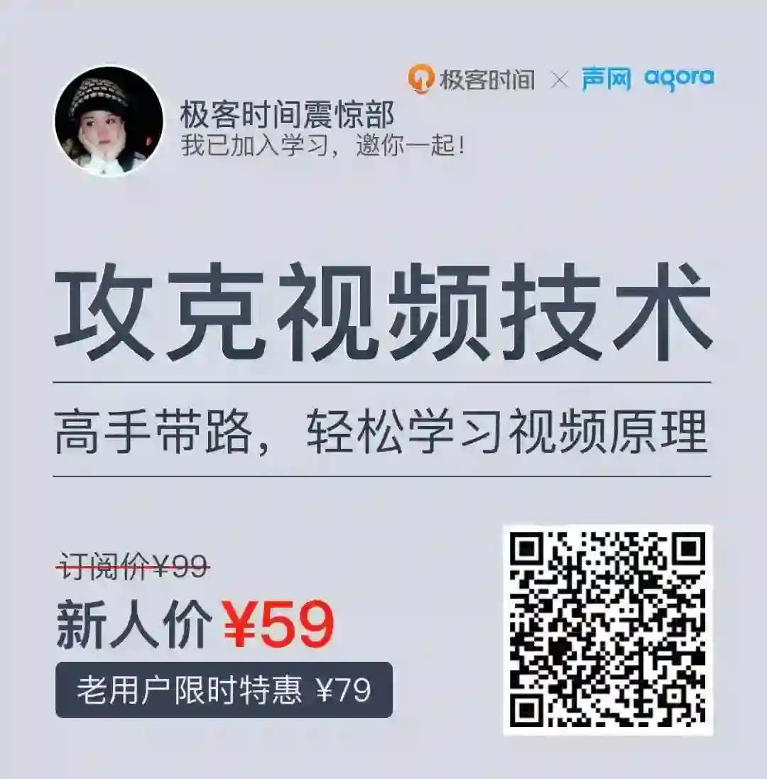 最近,看到他们跟极客时间联合出了 2 门关于音频、视频技术相关的课,第一时间就订阅来看,不得不说,想学音视频技术,还得看声网的专家,在这个领域,没有比他们更有话语权的了。