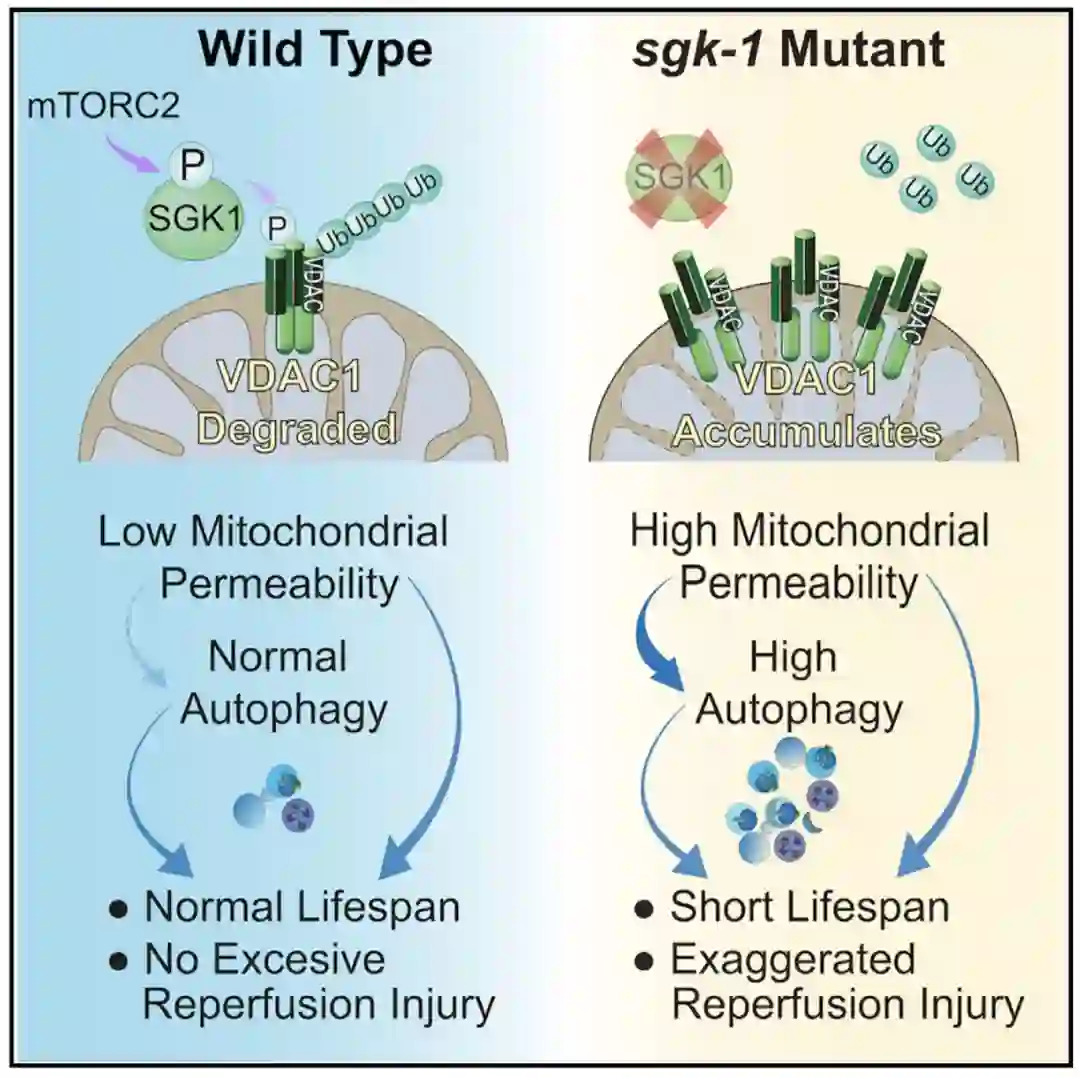 为了解释这个现象,在本项研究中,研究人员发现,SGK-1 可以直接磷酸化电压依赖性阴离子通道(VDAC1)并促进其降解,从而降低线粒体通透性。而过表达 VDAC1 基因将上调自噬相关基因的表达,并缩短线虫的寿命;而抑制自噬则可以使该模型寿命延长。令人惊讶的是,上调 VDAC1 的表达还会抑制由热量限制、生殖缺陷、线粒体减少导致的长寿效应。