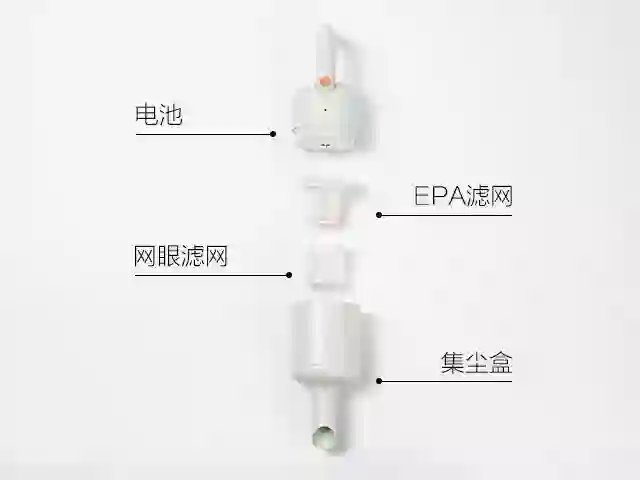 主机由电池、双层滤网(包括EPA滤网、网眼滤网)和集尘盒组成。