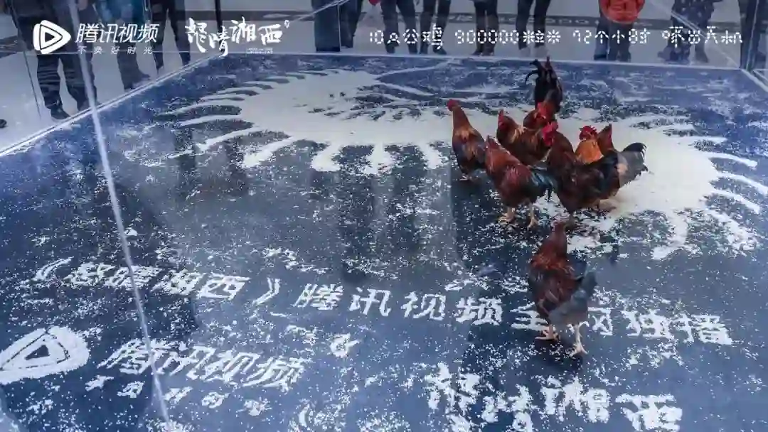 刚才说到10只鸡演员在上海月星环球港的卖力表演,其实这一切都是网剧《怒晴湘西》的第一波预热动作,让上海商场里这10只湘西公鸡在大庭广众的强势围观之下,用72小时慢慢地啄食铺满地面的900000粒大米,才会露出巨大的蜈蚣boss图形和“《怒晴湘西》腾讯视频全网独播”的关键信息。