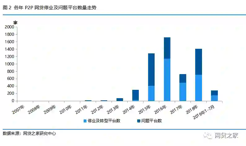 据网贷之家统计,截至2019年7月底,P2P网贷行业累计停业及问题平台数量总计达到5830家,其中问题平台2827家,停业及转型3003家。