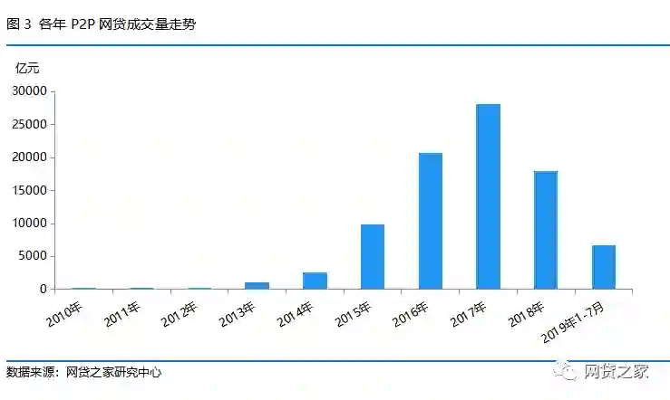 2015年之后P2P网贷成交量呈大幅增长趋势,并在2017年达到顶峰,2017年全年成交量达到2.8万亿元;