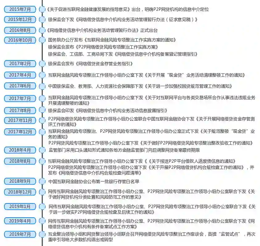 2019年7月互金整治领导小组和网贷整治领导小组联合召开的网络借贷风险专项整治工作座谈会首提“监管试点”,并且重申引导绝大多数机构退出或转型。