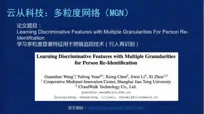 刚才讲了 ReID 研究方面的 5 个方案。接下来要讲的是多粒度网络的结构设计与实现。有人问 MGN 的名字叫什么,英文名字比较长,中文名字是对英文的一个翻译,就是“学习多粒度显著特征用于跨境追踪技术(行人在识别)”,这个文章是发表于 4 月初。