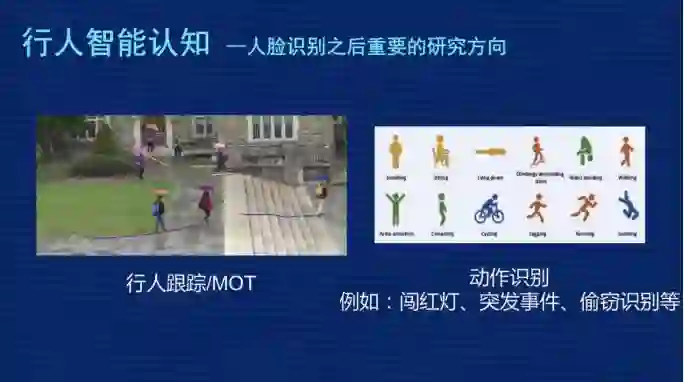 5、动作识别。动作识别是基于视频的内容理解做的,技术更加复杂一点,但是它与人类的认知更加接近,应用场景会更多,这个技术目前并不成熟。动作识别可以有非常多的应用,比如闯红灯,还有公共场合突发事件的智能认知,像偷窃、聚众斗殴,摄像头识别出这样的行为之后可以采取智能措施,比如自动报警,这有非常大的社会价值。