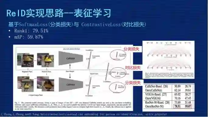 这个方案是通过设计分类损失与对比损失,来实现对网络的监督学习。它测试时取的是 4096 这个向量来表征图片本人。这个文章应该是发在 2016 年,作者当时报告的效果在当时的时间点是有一定竞争力的,它的 Rank1 到了 79.51%,mAP 是 59.87%