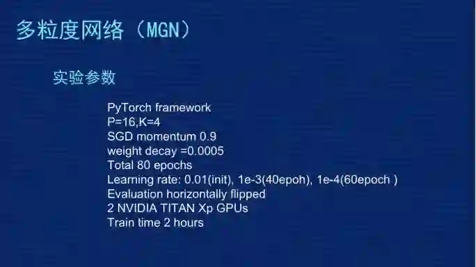 这是 MGN 的网络架构完整的图,这个网络图比较复杂,第一个,网络从结构上比较直观,从效果来讲是比较有效的,如果想复现我们的方案还是比较容易的。如果你是做深度学习其他方向的,我们这个方案也有一定的普适性,特别是关注细粒度特征时,因为我们不是只针对 ReID 做的。我们设计的结构是有一定普适性,我把它理解为“易迁移”,大家可以作为参考。