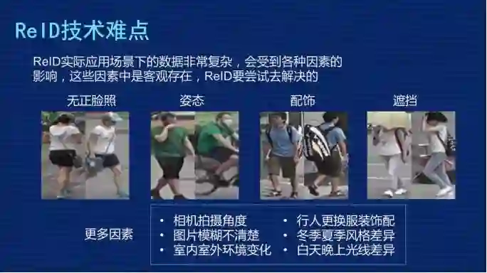 为什么?第一,ReID 有很多技术难点。比如 ReID 在实际应用场景下的数据非常复杂,会受到各种因素的影响,这些因素是客观存在的,ReID 必须要尝试去解决。