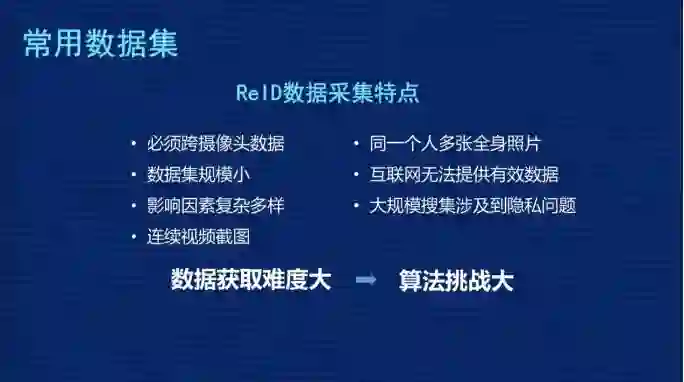 这些都是 ReID 数据采集的特点,可以归结为一句话:“数据获取难度大,会对算法提出比较大的挑战。”问题很复杂,数据很难获取,那怎么办?现在业内尽量在算法层面做更多的工作,提高 ReID 的效果。