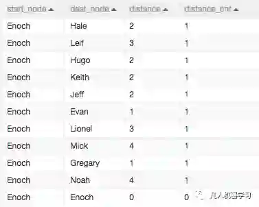 通过“单源最短路径”组件探查出每个人的一度人脉、二度人脉关系等。distance讲的是“Enoch”通过几个人可以联络到目标人。