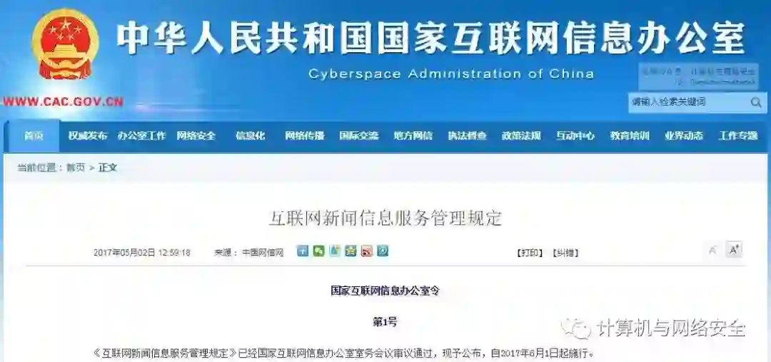 为加强互联网信息内容管理,促进互联网新闻信息服务健康有序发展,根据《中华人民共和国网络安全法》《互联网信息服务管理办法》《国务院关于授权国家互联网信息办公室负责互联网信息内容管理工作的通知》,2017年5月2日,国家互联网信息办公室发布1号令,公布新版《互联网新闻信息服务管理规定》(简称《规定》),自2017年6月1日起施行。
