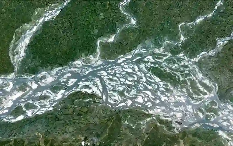 不过一些河流的河床凹凸不平,使得上面的水流不断地分叉又汇集,从远处看就像大地扎着许多小辫子一样。这样的河流就叫做辫状河(braided rivers,也叫分汊河)。