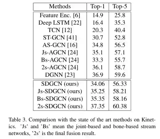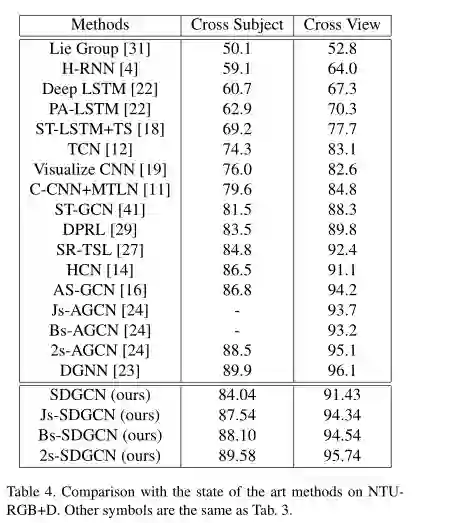 文中也在两个数据集上对比了SDGCN与其它基准模型的效果,如表3与表4所示,可以看到2s-SDGCN的性能优与大部分的基准模型。