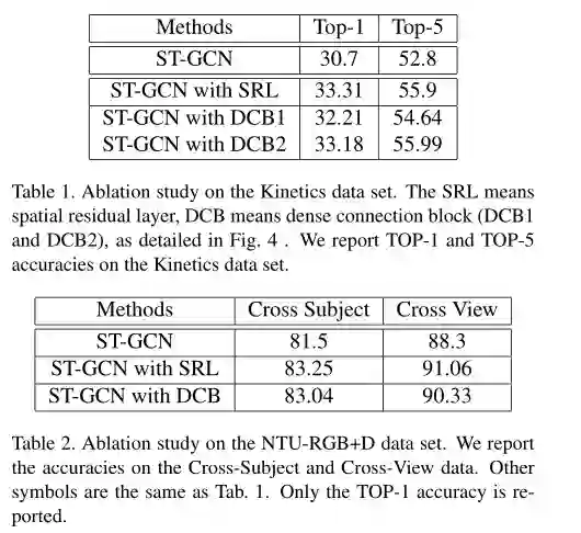 为了探索空间残差层与密集连接的效果,文中使用STGCN作为基准模型,分别在两个数据集上对比了只包含这两个模块的模型的结果,从表1与表2中我们可以得到与原始STGCN相比,空间残差层与密集连接对于动作识别的准确率都有所提升。