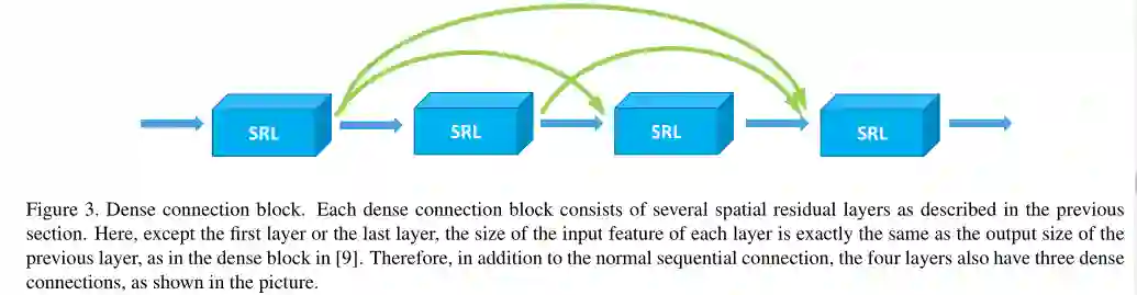 整个网络结构由3个密集连接块组成,并且文中设置了两中不同的框架,右侧框架(DCB2)中每个模块由三个密集连接块组成,每个密集连接包含四个空间残差层。而在左侧框架(DCB1)中,除了第一个连接块与右侧一致之外,之后两个块的层数都减少到了三层。