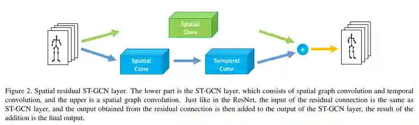 为了更有效地学习时空信息,文中在时空GCN层的输入和输出之间引入了一种二维空间残差结构(绿色块),如下图所示: