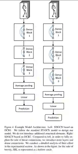 从DenseNet中受到启发,文中在时空图卷积网络中引入了密集连接,下图为一个密集连接块的示例,每一个SRL层的输入特征都与先前的SRL层的输出特征有关。