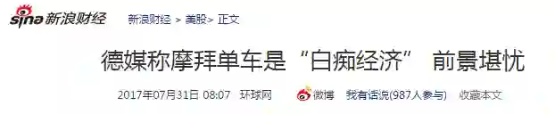 德国“经济周刊”报道认为中国大陆共享单车的前景堪忧,大多数公司尽管发展迅速、吸引了许多投资,却赚不了钱。报道估算,每辆共享单车价值280欧元,每天必须使用5次,才能在一年内达到损益平衡。而摩拜单车的顾客平均4天才借一次车,且每小时才人民币1元的价格太便宜。