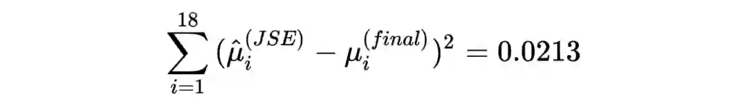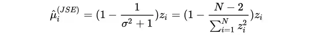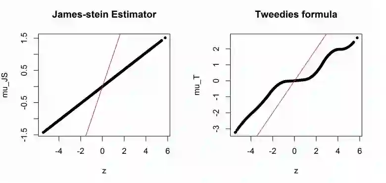 而经验贝叶斯中的两个重要节点:之前所提到 James-Stein estimator 的和本文分享的 Tweedie's formula 则惊奇地有与 Ridge 和 Tweedie's formula 相似的效果。如下图所示,黑色为 JSE 和 Tweedie's formua 的估计值,红色线为 。