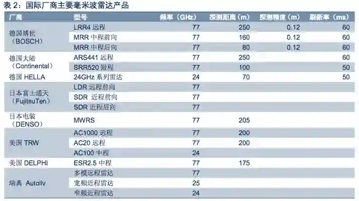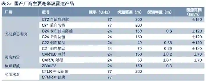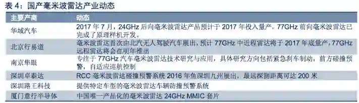 国内毫米波雷达产品在精度、探测距离方面相对落后,24GHz已取得快速进展。目前,芜湖森思泰克,湖南纳雷、亚太股份的杭州智波等企业已推出多款产品化的77GHz、24GHz毫米波雷达,华域汽车、南京隼眼等企业也在进行相关的产品研发。