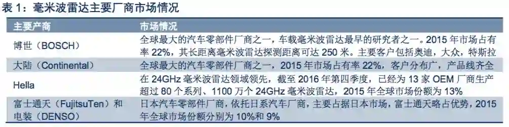 国际巨头在毫米波雷达领域研究历史久,技术积累深厚,在全球市场占据支配地位。车载毫米波雷达的研究主要在以德国、美国及日本为代表的一些发达国家内展开。目前,毫米波雷达的技术主要由博世、大陆、电装、奥托立夫、德尔福等传统零部件巨头所垄断。