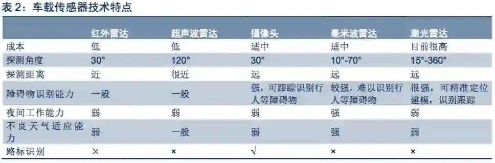 从发展趋势来看,红外雷达由于性能限制已被基本放弃。超声波雷达由于成本低廉,现在多用于防撞预警系统,比如倒车雷达,未来完全可以被激光雷达替代。摄像头可以实现障碍物、路标的识别分辨,与驾驶者感官最为接 近,在智能驾驶中仍会发挥不可取代的作用,但不是本篇车载雷达报告的重点。