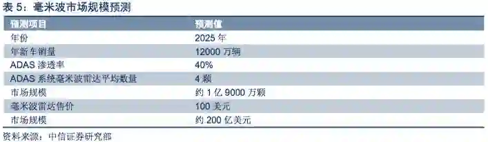 按照当前全球汽车销量增速,假设2025年全球新车销量为1.2亿辆,ADAS渗透率40%,毫米波雷达单枚售价降至100美元,则毫米波雷达市场规模可达200亿美元左右。