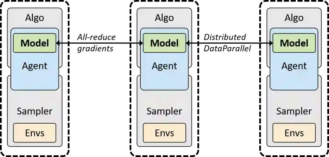 同步多进程强化学习。每个 Python 进程运行一个完整 sample-algorithm 栈副本,「同步」则通过 PyTorch 中的 DistribuedDataParallel 在反向传播过程中隐式地实现。支持 GPU(NCCL 后端)和 CPU(gloo 后端)模式。