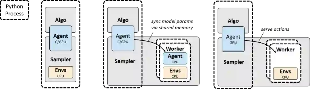 环境交互采样图示。(左)串行:智能体和环境在一个 Python 进程中执行。(中)并行-CPU:智能体和环境在 CPU 上运行(并行 worker 进程)。(右)并行-GPU:环境在 CPU 上运行(并行 worker 进程),智能体在核心进程上运行,以保证分批动作选择。