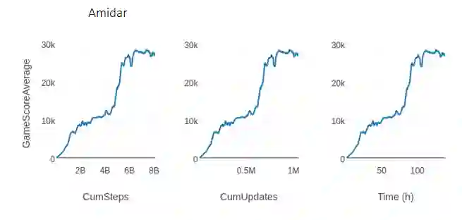 R2D2 的最初分布式实现使用了 256 块 CPU 进行采样,一块 GPU 执行训练,每秒运行 66,000 步。而 rlpyt 仅使用了一个包含 24 块 CPU(2x Intel Xeon Gold 6126)和 3 块 Titan-Xp GPU 的工作站,以每秒 16000 的步数完成实现。对于无法使用分布式基础架构的情况而言,这已经足够执行实验了。未来研究的一种可能是:利用多 GPU 优化增加 replay ratio,从而加快学习速度。下图展示了相同学习曲线在 3 种不同度量指标下的呈现,这 3 种度量指标分别是:环境步数(即 1 步=4 帧)、模型更新和时间。它在不到 138 个小时的时间内走完了 80 亿步,完成了 100 万次模型更新。