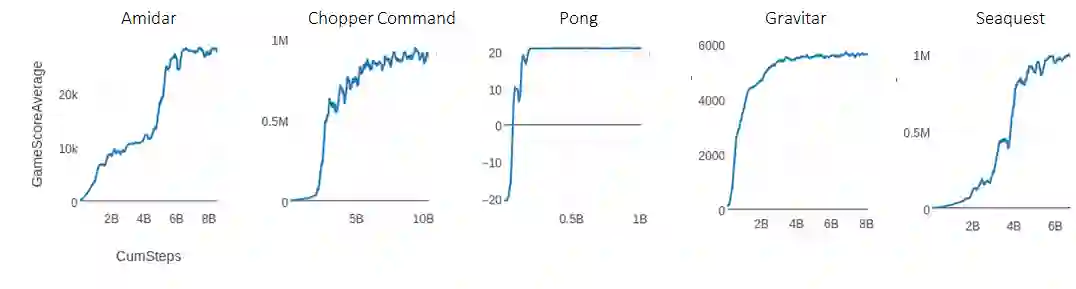 BAIR 展示了在 Atari 领域中复现 R2D2 结果的学习曲线,在以前只有使用分布式计算才会出现这样的学习曲线。该基准包括使用约 100 亿样本(400 亿帧)基于 replay buffer 训练得到的循环智能体。R2D1(非分布式 R2D2)使用 rlpyt 中多个更先进的基础架构组件来实现它,即使用 alternating-GPU 采样器的多 GPU 异步采样模式。下图展示了复现过程中的学习曲线,其中多个超过了之前的算法。我们需要注意,这些结果并未在所有游戏上完美复现,例如 Gravitar 游戏在比较低的得分处就已进入平台期。详情参见相关论文。