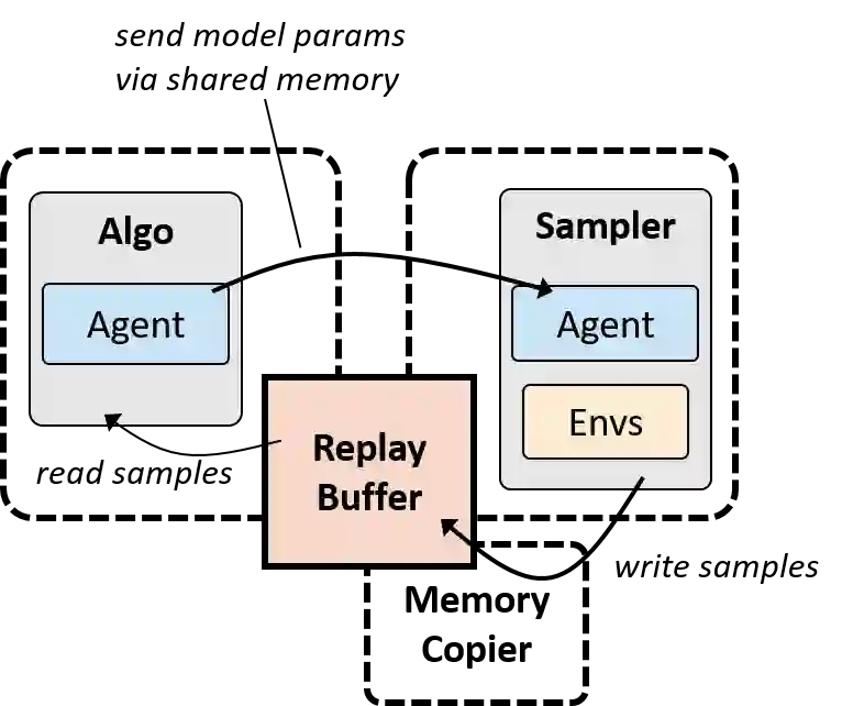 在目前已经介绍的配置中,采样器和优化器都是在同一个 Python 进程中顺序运行的。而在某些案例中,异步运行优化和采样可以实现更好的硬件利用率,因为这使得优化和采样连续运行。BAIR 在复现 R2D2 时就是这样,基于真实机器人学习也是这样的模式。