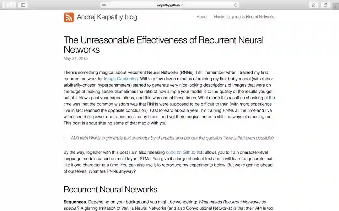 和 Karpathy 对RNN大唱赞歌的文章《效果无比出色的循环神经网络》