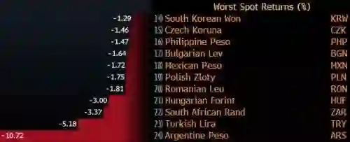值得注意的是,阿根廷遭遇股债汇三杀。阿根廷比索兑美元日内最深跌逾7%,至1美元兑27.9837比索的历史新低;追踪阿根廷的MSCI ETF(ARGT)跌逾2%,创去年9月初以来最低。