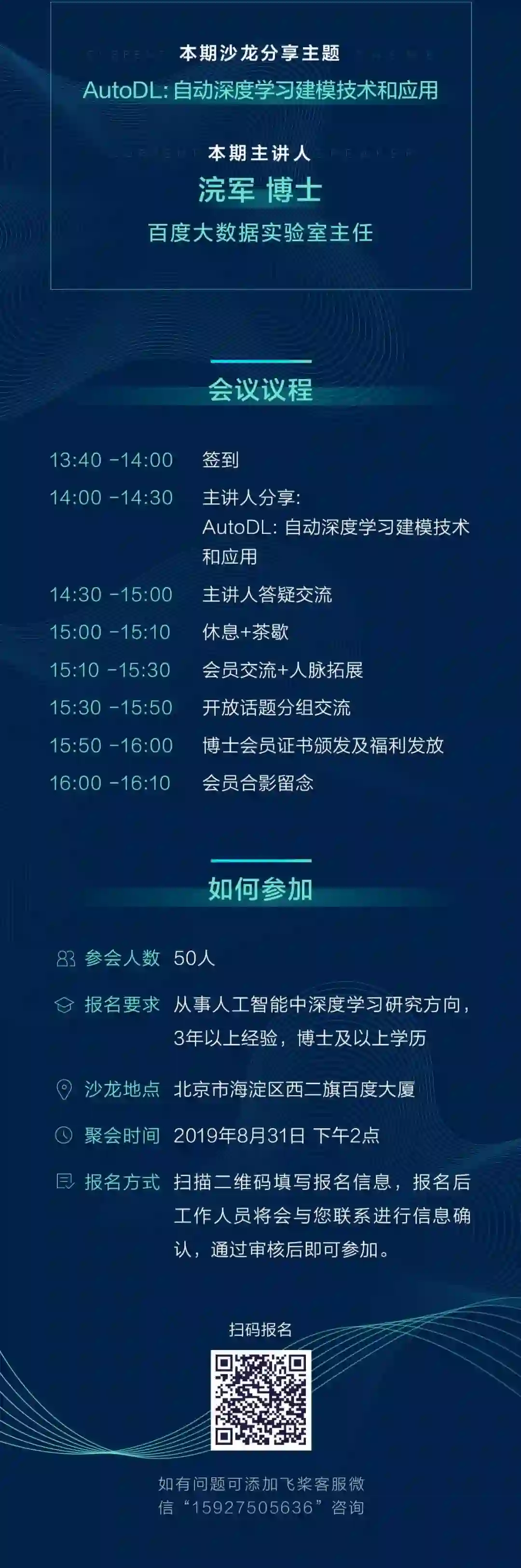 8月31日将举办第三期线下技术沙龙,本期邀请百度大数据实验室主任浣军博士分享《AutoDL: 自动深度学习建模技术和应用》,诚邀各位加入。